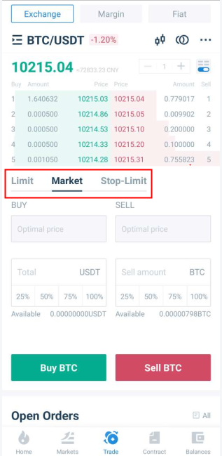 4.You can then choose Limit/Market price trading based on your needs. The so-called Limit orders are takers. You can set the price yourself for a limit order. The trading can be completed once the market price reaches or is better than the set price. When the set selling price is lower than current market price, the transaction will be done at the market price; When the purchase price is higher than market price, the transaction will be done at the market price.